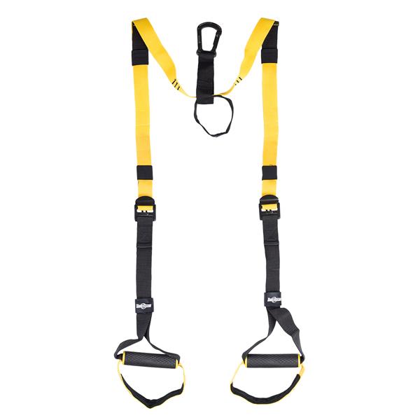 Набор содержит обучающие ленты, завершенные ручками и металлическим карабином, дверной ручкой и сеткой. Ручки покрыты пеной, так что ваши руки не скользят во время тренировки.