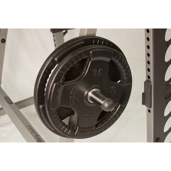 Конструкция тренажера построена на высокопрочном стальном профиле 50*76 мм. и выдерживает нагрузку до 450 кг. Имеет 14 точек фиксации штанги, позволяет атлету изменять высоту расположения штанги на стойках не снимая блины. Высота нижнего крюка (фиксирующего гриф) составляет 363 мм. от поверхности пола.