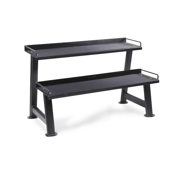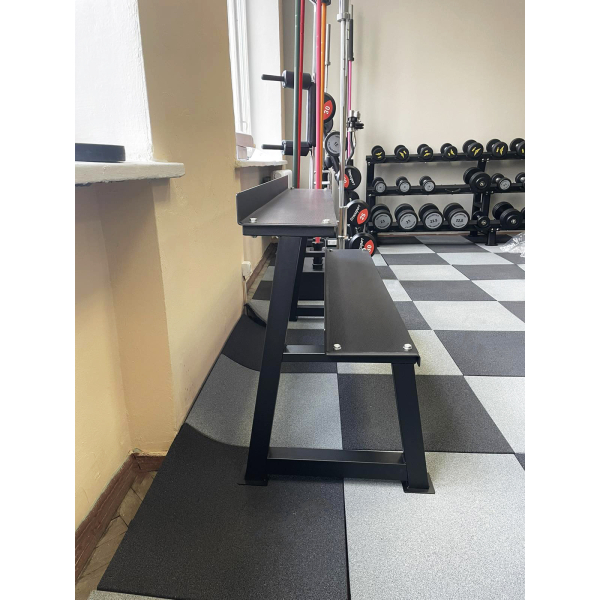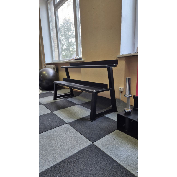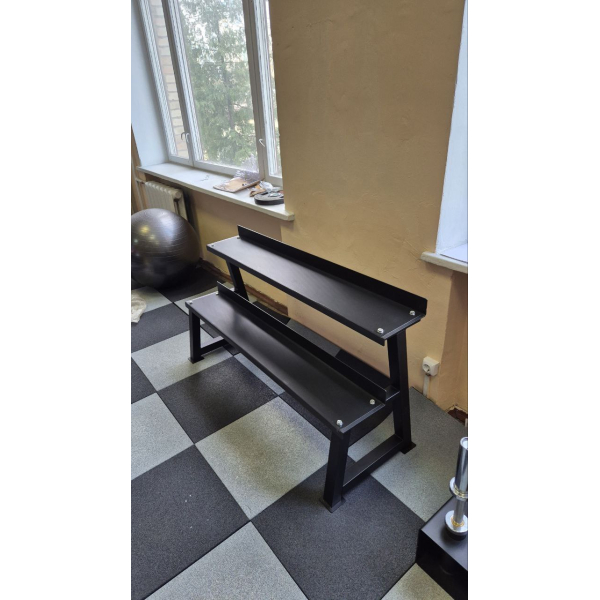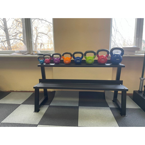 Двоярусна конструкція: Стійка має два яруси для зберігання гирь, що дозволяє економити простір і забезпечує зручний доступ до кожної гирі.